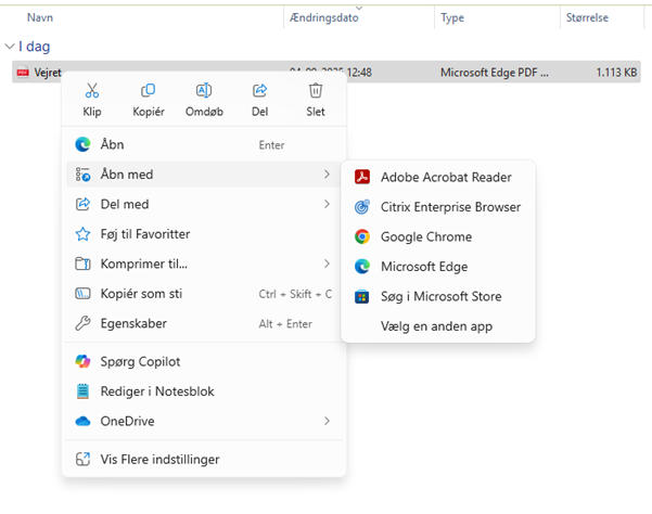 Højreklik på PDFen og vælg “Åbn med” og “Microsoft Edge”: