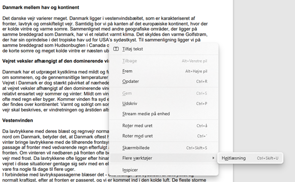 tekststykket, højreklikke, vælge “Flere værktøjer” og “Højtlæsning”. Du kan også bruge genvejen Ctrl + Shift + U, når du har markeret tekststykket.