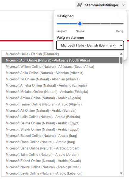 Vælg en stemme, hvor der står “(Natural)”, selvom den ikke er dansk, f.eks. “Microsoft Adri Online (Natural)”: